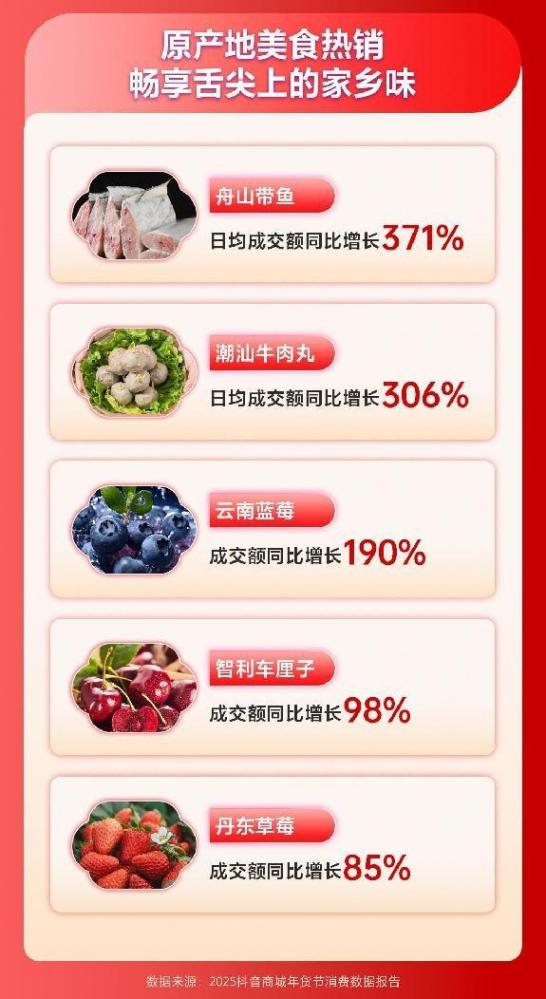 團圓時刻,一桌豐盛可口的年夜飯必不可少。年貨節期間,抖音電商深入冬季時令生鮮原產地,優選源頭好物送往千家萬戶,也為新春餐桌增添一份健康。報告顯示,各類海鮮水產和牛羊肉制品受到消費者喜愛,舟山帶魚日均成交額同比增長371%,潮汕牛肉丸日均成交額同比增長306%,大連海參周期內成交額同比增長50%。