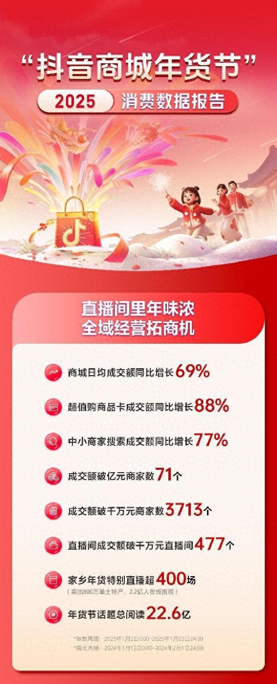 1月24日,“抖音商城2025年貨節”數據報告(下稱“報告”)發布,呈現蛇年春節年貨銷售情況及大眾購買偏好。數據顯示,1月2日至22日,抖音商城日均成交額較去年同比增長69%,超值購商品卡成交額同比增長88%,中小商家搜索渠道成交額同比增長77%。辭舊迎新之際,年貨市場供需兩旺,眾多商家借力年貨節迎來生意增長。本次大促期間,71個商家成交額破億元,3713個商家成交額破千萬元。