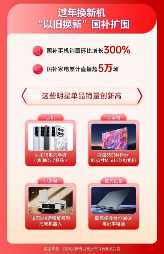 數據顯示,1月1日以來,平臺累計落地了5.2萬場國補直播活動,用戶觀看達2987萬小時。活動上線首日,平臺上參與國補的手機銷量環比增長300%,5000元熱門手機機型搜索同比增長200%。在國補政策刺激下,小米15系列手機(澎湃OS2系統)、海信85E5N Pro+ 85英寸Mini LED電視機、追覓S40增強版系列掃地機器人、聯想拯救者Y7000P筆記本電腦等單品銷量均創下新高。