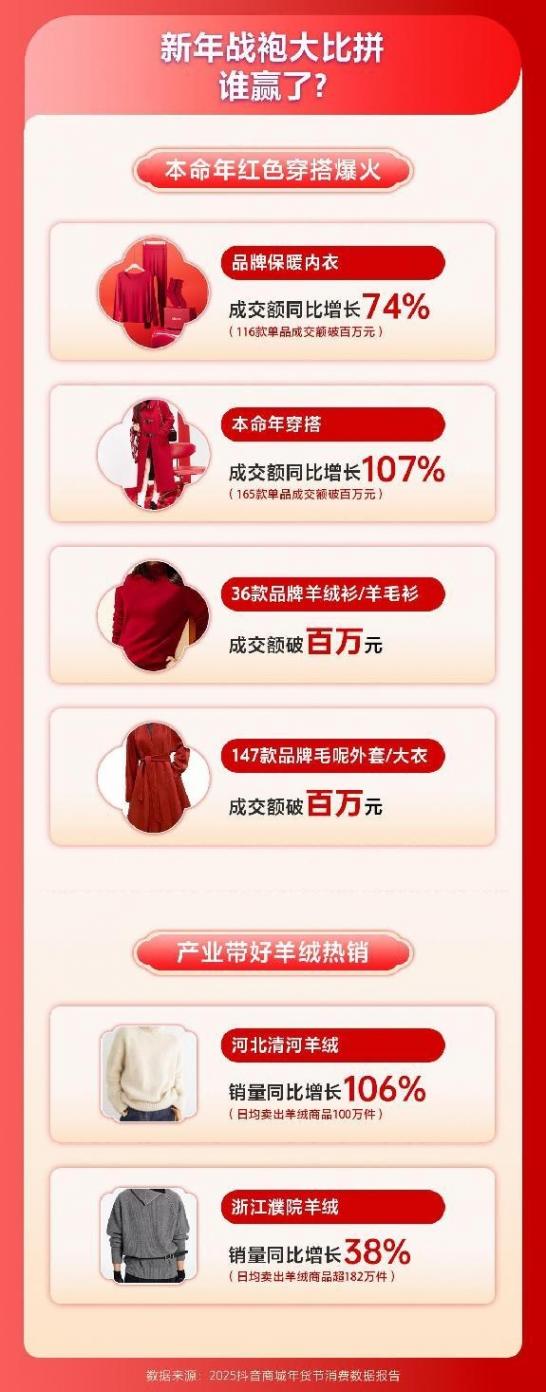 報告顯示,在抖音電商平臺,本命年穿搭相關產品成交額同比增長107%,165款單品成交額破百萬元。在中國人的傳統中,紅色代表好運,本命年穿紅色秋衣秋褲寓意紅紅火火。數據顯示,品牌保暖內衣成交額同比增長74%,116款單品成交額破百萬元。