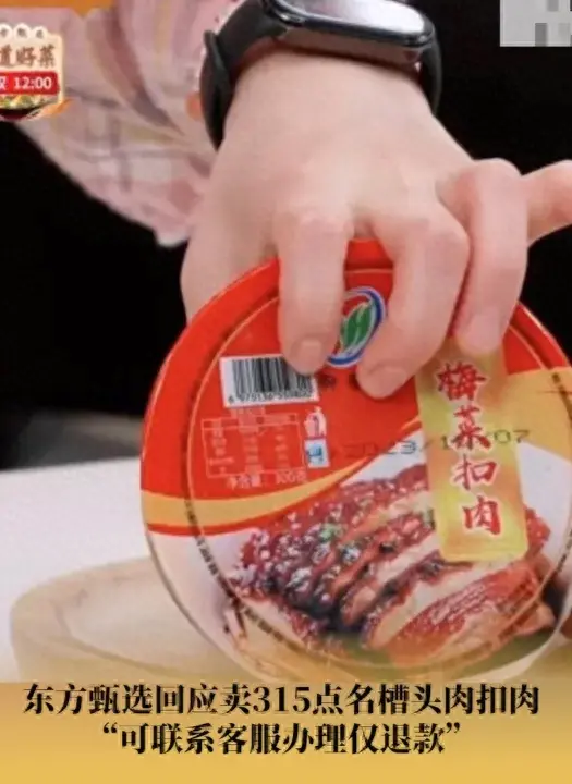 3月16日,315晚會曝光了“安徽東輝科技食品有限公司”生產的“御徽緣”梅菜扣肉,使用的都是槽頭肉,并且含有大量未經處理干凈的淋巴肉和甲狀腺,槽頭肉不屬于食品原料、禁止食用,這嚴重不符合《食品安全標準》。“東方甄選”和“瘋狂小楊哥”直播間都銷售過這款產品。