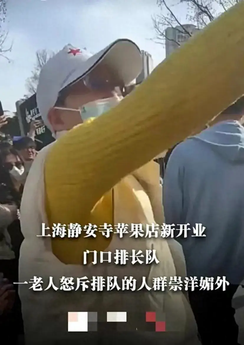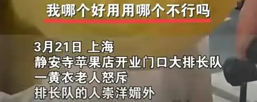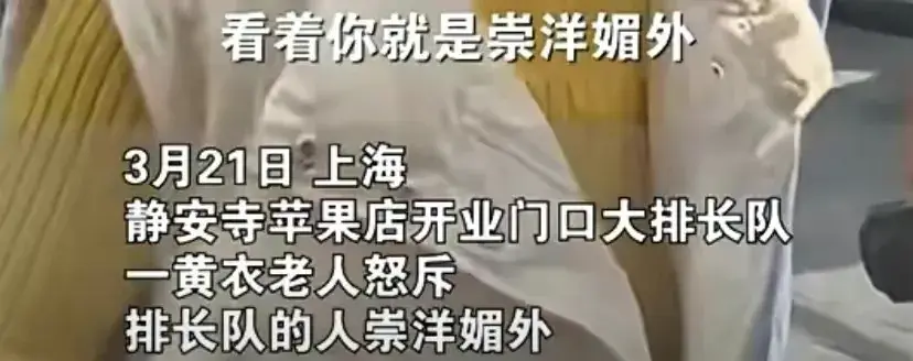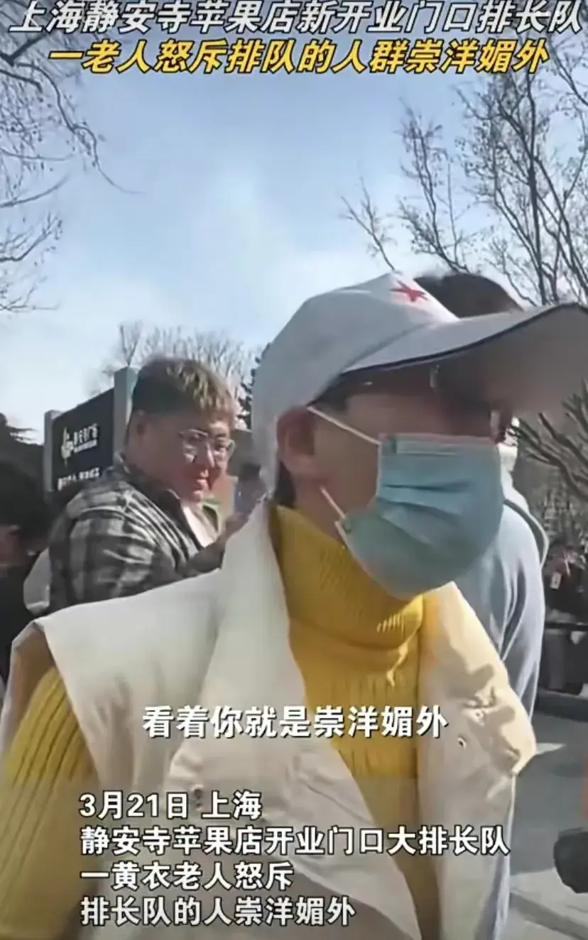 2021年8月的一個陽光明媚的周末,上海蘋果靜安店門口熙熙攘攘,人頭攢動。來自四面八方的果粉們排著長隊,翹首以盼地等待進入店內(nèi)體驗新品。突然,一位滿頭白發(fā)、年約六旬的大媽出現(xiàn)在隊伍中,她一臉憤怒地指著這些年輕的果粉們破口大罵:“崇洋媚外!你們這些年輕人,為什么總是盲目追求外國品牌,而不支持我們自己的國產(chǎn)品牌?”