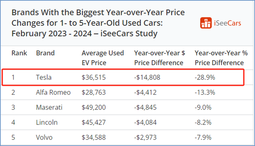 不久前權威機構ISeeCars發布的研究報告顯示:特斯拉是美國市場上二手車貶值速度最快的品牌。