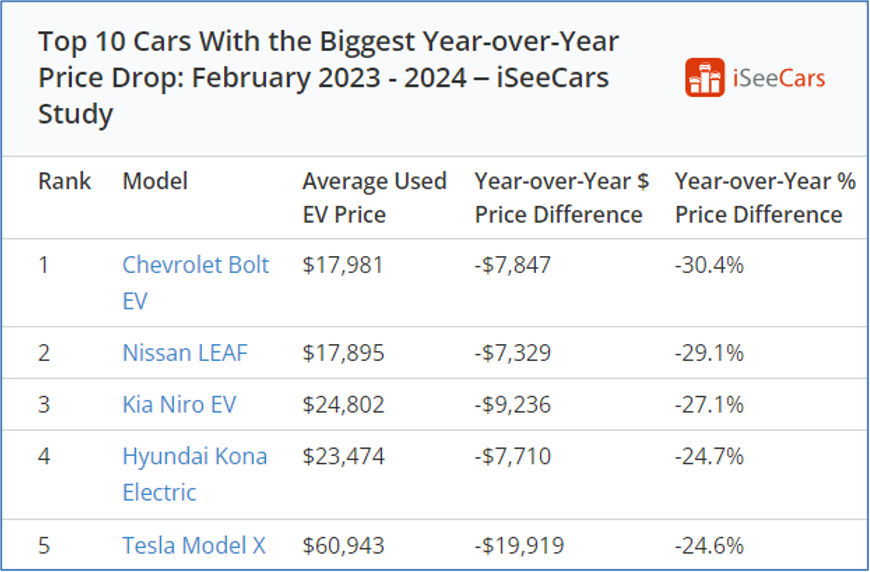 過去一年時間里,雪佛蘭旗下的Bolt EV貶值30.4%,而日產LEAF貶值了29.1%,都超過特斯拉。