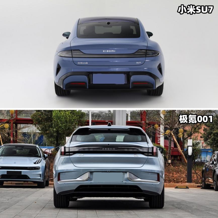 最后再來(lái)看看車尾,小米SU7的尾燈采用星環(huán)設(shè)計(jì),下方是大面積的黑色后包圍,在內(nèi)部還有與車身同色的裝飾,另外兩側(cè)同樣也有進(jìn)氣口。而極氪001,其后風(fēng)擋上配備了001 FR同款的擾流板,中央是貫穿式尾燈,同樣很有設(shè)計(jì)感,下方的后包圍也采用了001 FR的造型。
