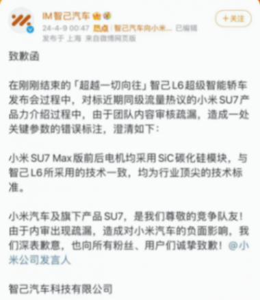4月9日凌晨 00:47,@智己汽車官方微博 正式發布道歉信。