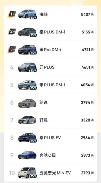 海鷗以5407輛奪取第一名,相比上周7200輛減少1793輛;秦PLUS DM -i銷量為5155輛,排在第二名,相比上周6565輛減少1410輛;宋Pro DM-i銷量為4721輛,排在第三名,相比上周6791輛減少2070輛。