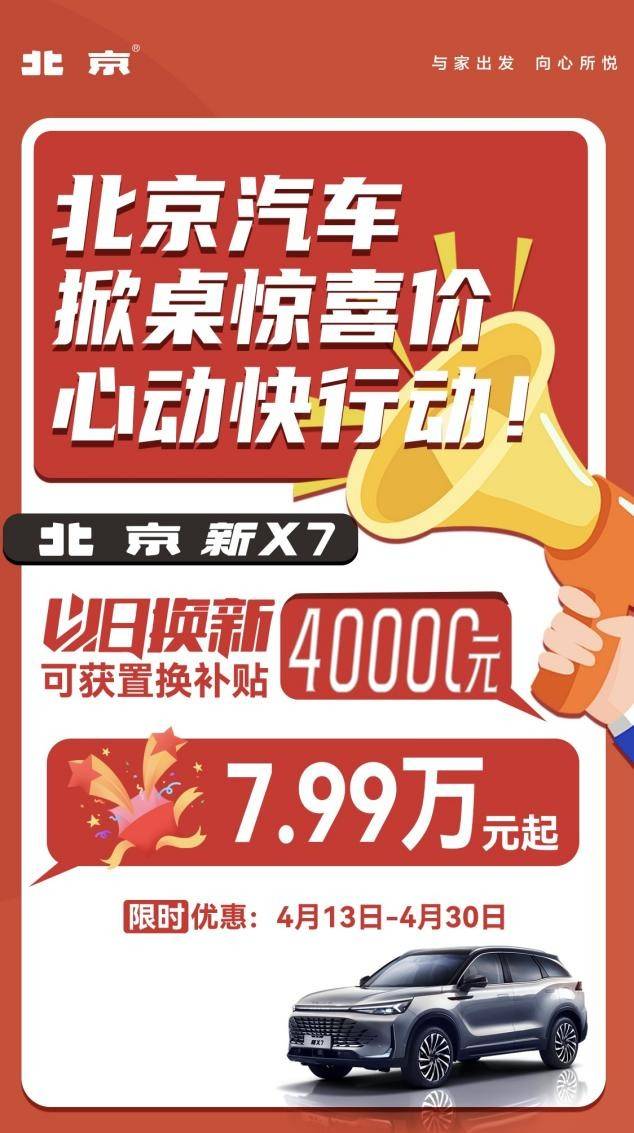 最美人間四月天,正是出門游玩的好時候,有不少的朋友在計劃購新車出去玩,政策利好的情況下,各大車企紛紛都推出了各種“以舊換新”的置換補貼政策,顯然,北京汽車新X7這波優惠無疑是送到了消費者心坎上的力度。4萬元置換補貼政策,直接將起步價降至7.99萬元起,對于市場是一次重磅沖擊,對于消費者更是一個無法拒絕的選項。對于正計劃換車的用戶來說這份天降大禮不容錯過。